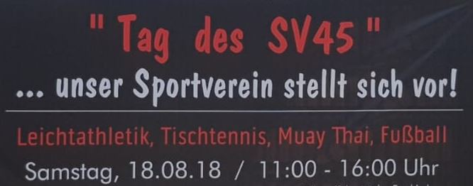 Es war eine gelungene Veranstaltung bei der sich alle Abteilungen des SV45 für die Öffentlichkeit präsentirt hatten. Das Angebot wurde entsprechend angenommen und auch das Wetter lachte an diesem Tag.